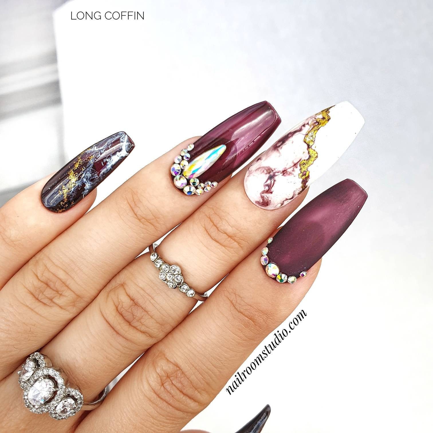 Popular long nail designs in burgundy colors.